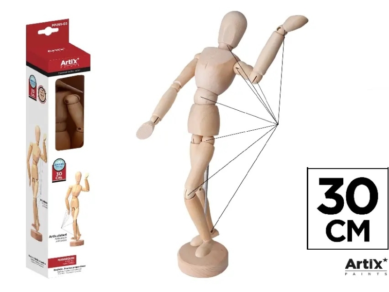 Дървеният манекен с височина 30 см е подвижен дървен модел, който служи за изучаване на човешките пропорции, движения и форми при рисуване и чертане; моделът е стабилен за настолна употреба и подходящ както за ученици и студенти, така и за професионални художници и дизайнери.