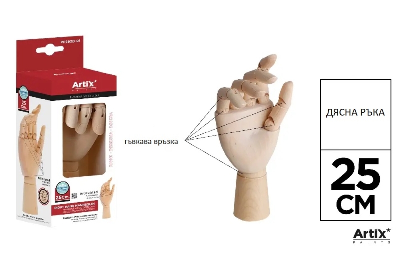 Дървеният модел на ръка MP Artix 25 см е подвижен арт инструмент с гъвкави 15 стави, който имитира естественото движение на човешката ръка за изучаване на форма и пропорции при рисуване, чертане и други художествени техники, подходящ за художници, дизайнери, студенти и начинаещи творци.