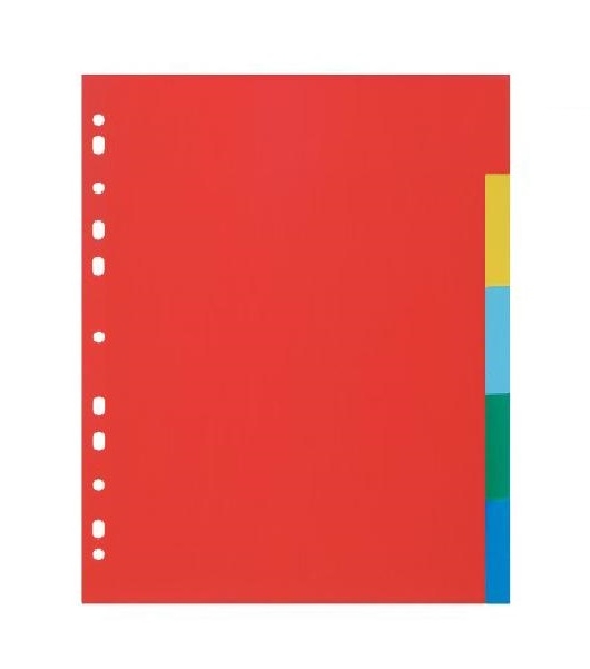 Практичен разделител от полипропилен в пет различни цвята. Издръжлив, влагоустойчив и многократно използваем. Осигурява отлична организация на документи в папки и класьори – подходящ както за офис, така и за домашна употреба.