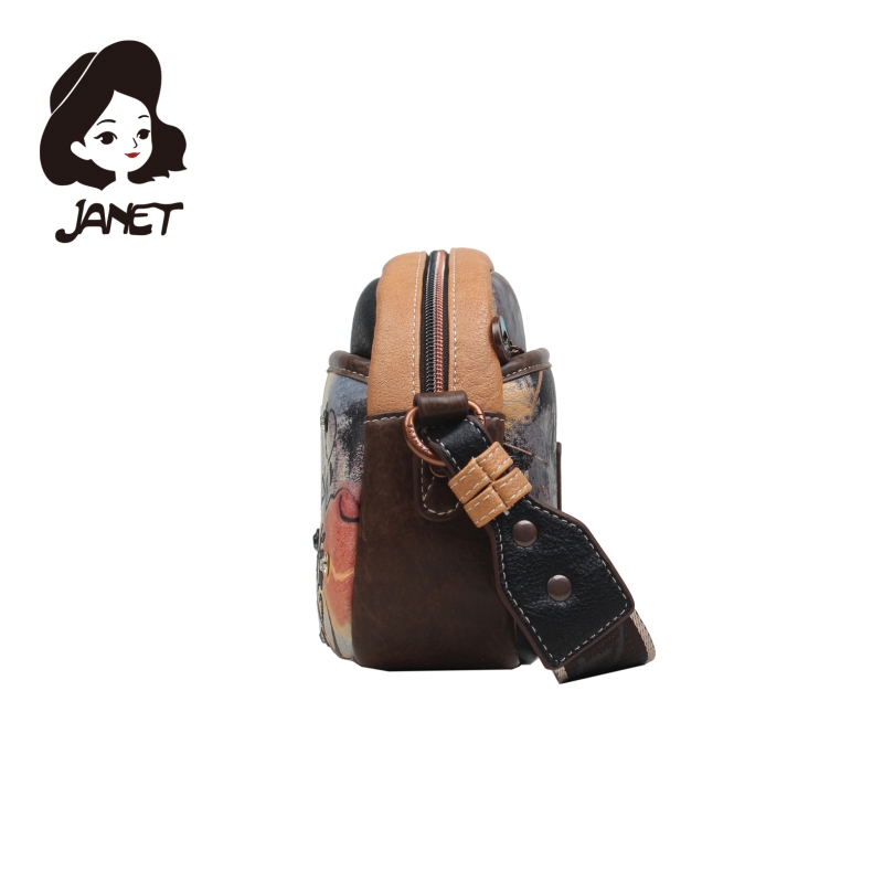 Чантата JANET „ART GALLERY“ е стилен и практичен аксесоар, създаден с мисъл за модерната жена и момичето, което търси индивидуалност. Размерите 24× 7 × 18 см я правят удобна за ежедневна употреба — идеална за работа, свободно време или пътуване. Марката JANET се отличава с екологична ангажираност: тази чанта е изработена без материали с животински произход, от висококачествена изкуствена кожа, която изглежда и се усеща като естествена.