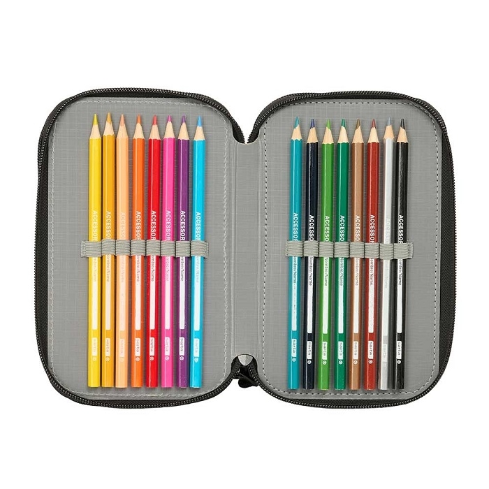 - съдържа 37 части: гумичка, графитен молив, синьо-червен химикал, острилка за моливи, гравирана синя линийка и полукръг (1-во отделение), 16 дървени цветни молива (2-ро отделение)