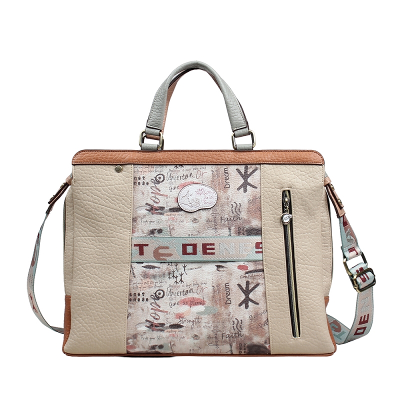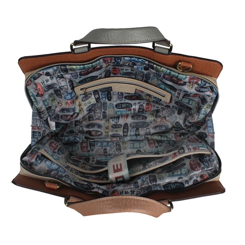 - Организация и пространство: Функционалност: Чантата има правоъгълна форма, която запазва структурата си. На лицевата част е добавен стилен вертикален цип с декоративен накрайник. Вътрешно разпределение: Интериорът е изключително добре организиран с характерната за марката подплата с ориенталски мотиви. Включва вътрешен джоб с цип и специално подплатено отделение, обезопасено с велкро лента, подходящо за таблет или аксесоари.